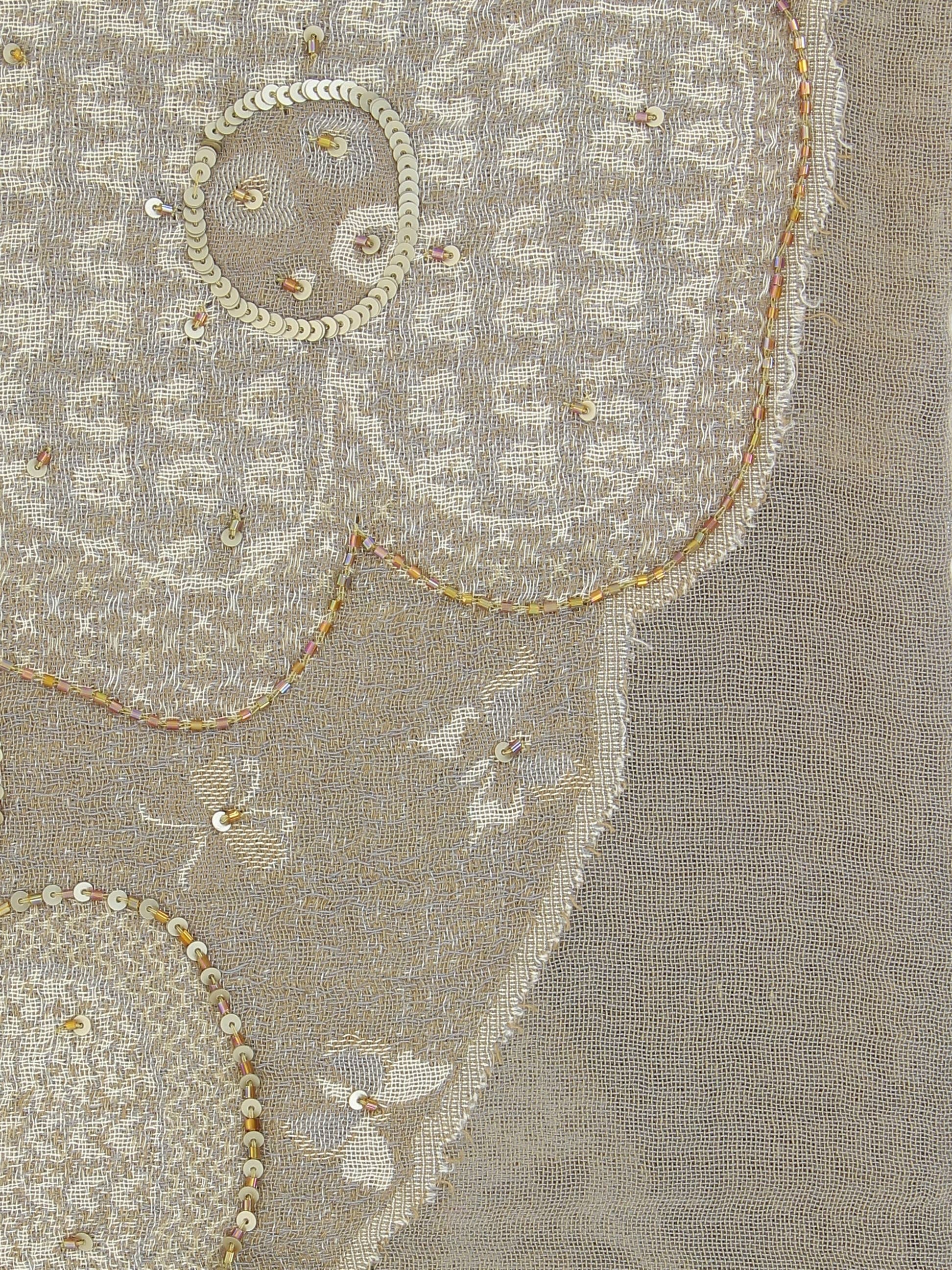 PAÑUELO DE ALGODÓN PURO EN TONOS TOPO, CON MOTIVOS DECORATIVOS DISTRIBUIDOS A LO LARGO DEL TEJIDO. PRESENTA BORDADOS EN RELIEVE, LENTEJUELAS, PEQUEÑOS DETALLES DECORATIVOS Y ABALORIOS COSIDOS A MANO, QUE APORTAN TEXTURA Y UN ACABADO CUIDADO A LA PIEZA.